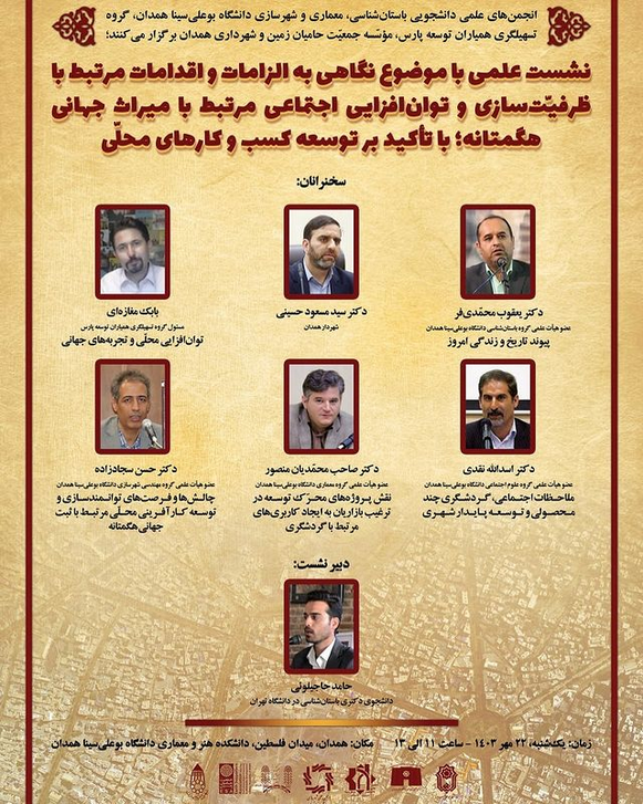 🔸نشست علمی با موضوع نگاهی به الزامات و اقدامات مرتبط با ظرفیّتسازی و توانافزایی اجتماعی مرتبط با میراث جهانی هگمتانه؛ با تأکید بر توسعه کسبوکارهای محلّی - دانشکده هنر و معماری