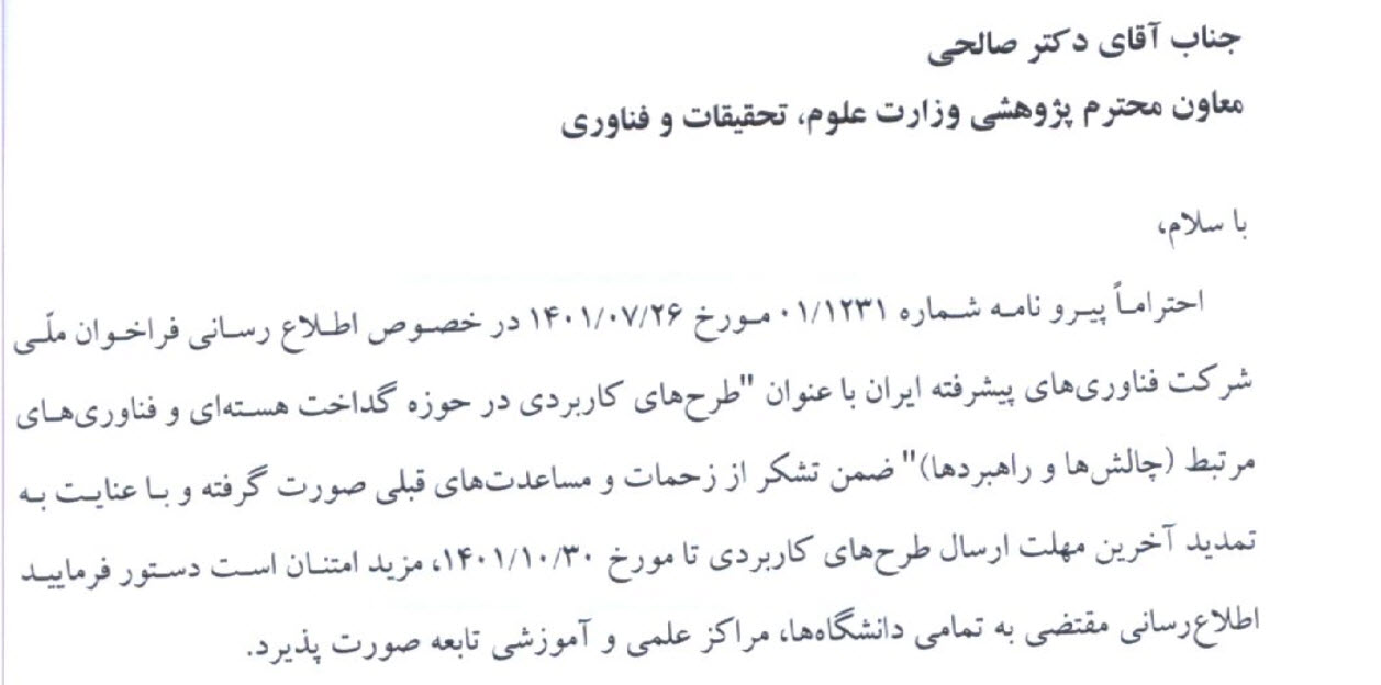 اطلاع رسانی فراخوان ملی طرح های کاربردی در حوزه گداخت هسته ای و فناوری های مرتبط(چالش ها و کاربردها)